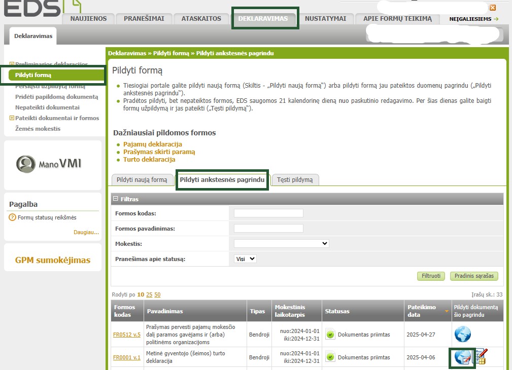 FR0001 deklaraciją galite užpildyti ir pateikti ankstesnių metų deklaracijos pagrindu skiltyje Deklaravimas -> Pildyti formą -> Pildyti ankstesnės pagrindu. Deklaracijai pildyti pasirinkite mėlyną gaublį. Atsidariusioje lentelėje įrašykite mokestinį laikotarpį (pvz., 2025 m.), už kuriuos teiksite deklaraciją, ir spauskite mygtuką Tęsti. Atsidariusiame deklaracijos šablone bus įrašyta Jūsų ankstesnių metų informacija, kurią, jei reikia, atitinkamai turite pakoreguoti pagal aktualaus mokestinio laikotarpio gruodžio 31 dienos duomenis.