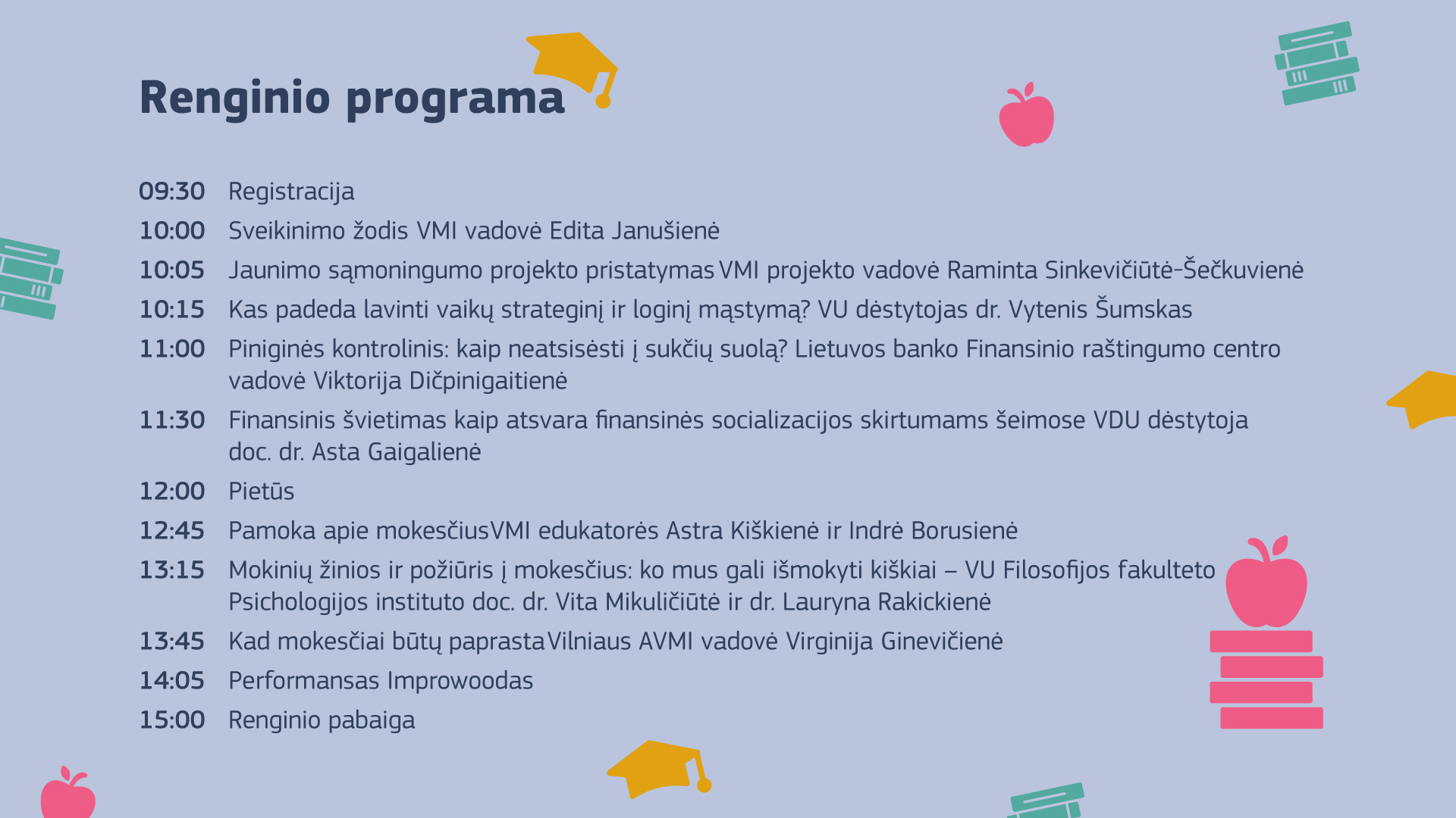 Renginys vainikuos kelerius metus trukusį VMI projektą „Būsimų mokesčių mokėtojų finansinio raštingumo didinimas“, kurio metu buvo įgyvendintos įvairios veiklos, stiprinančios vaikų ir jaunimo žinias apie mokesčius ir finansų pasaulį.
