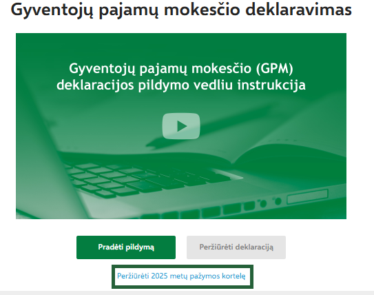 Pažymą, suformuotą pagal trečiųjų šaltinių duomenis (pvz., darbdavių, kredito įstaigų, Registrų centro ir pan.), apie gautas pajamas, išskaičiuotą pajamų mokestį, patirtas išlaidas rasite pirmajame vedlio lange, paspaudę mygtuką Peržiūrėti 2025 metų pažymos kortelę (žr. žemiau).