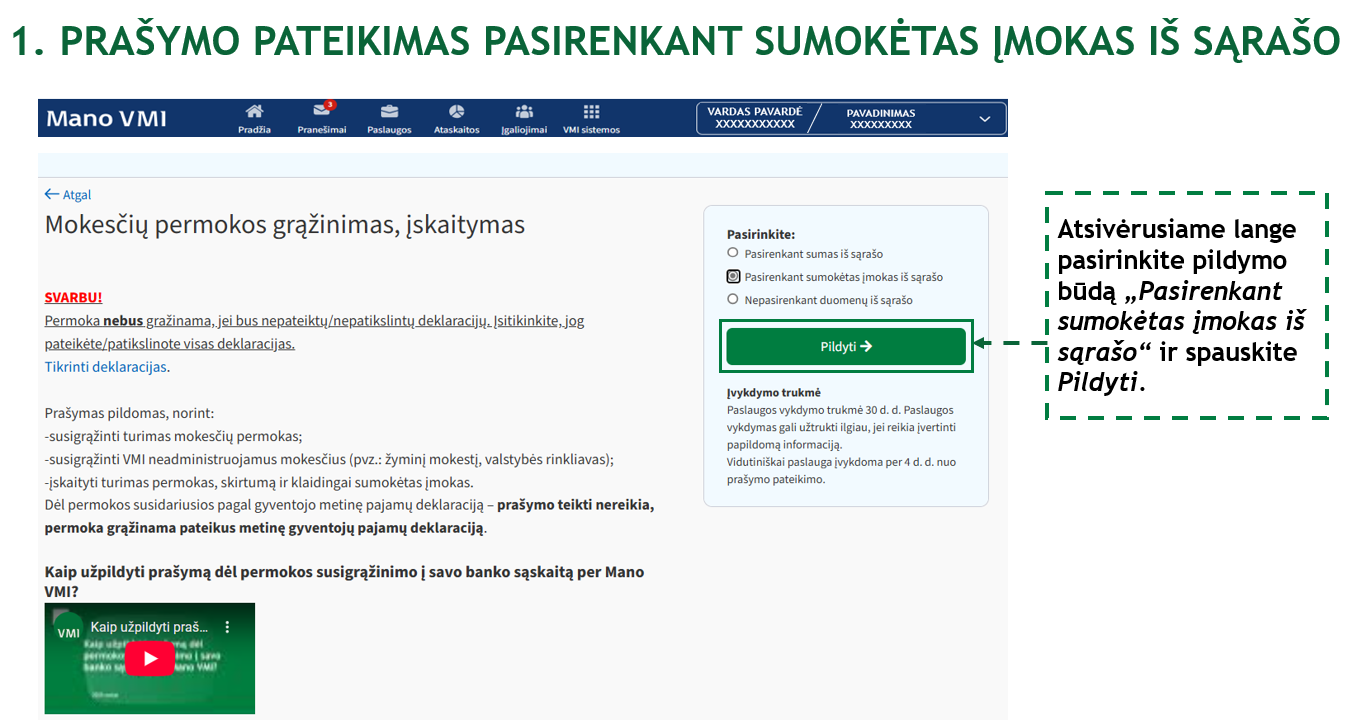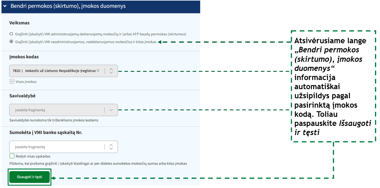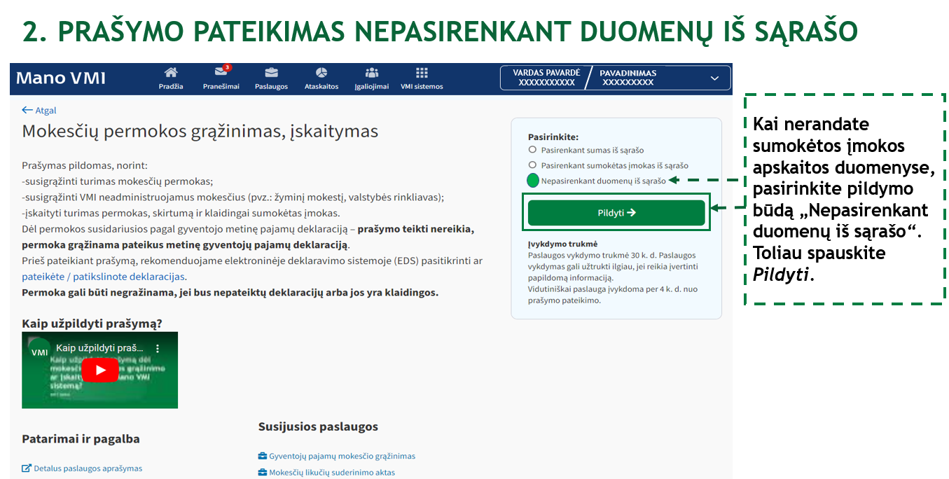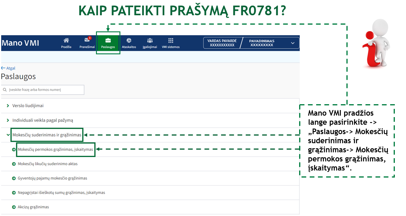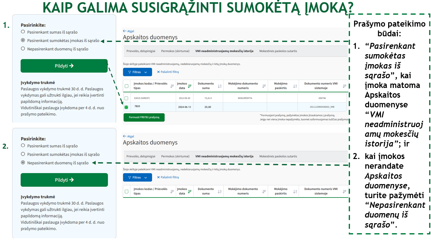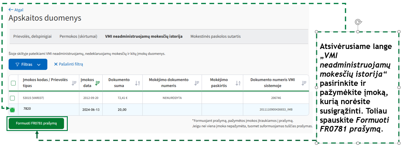 Prašymo FR0781 pateikimas norint susigrąžinti VMI neadministruojamą įmoką (rinkliavą) arba jos dalį per Mano VMI