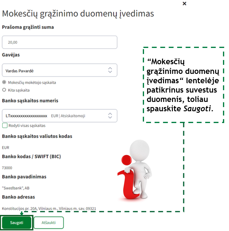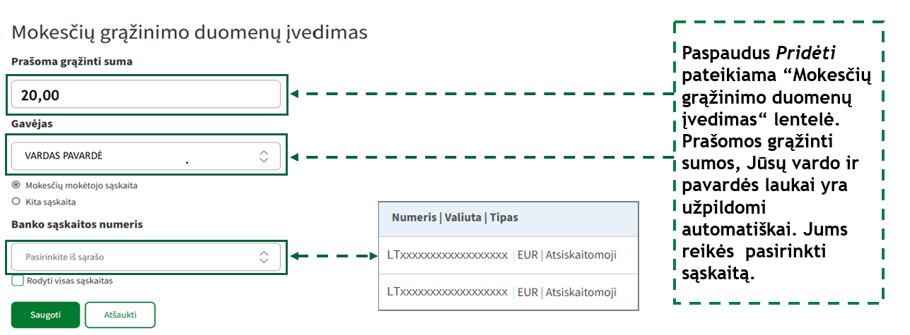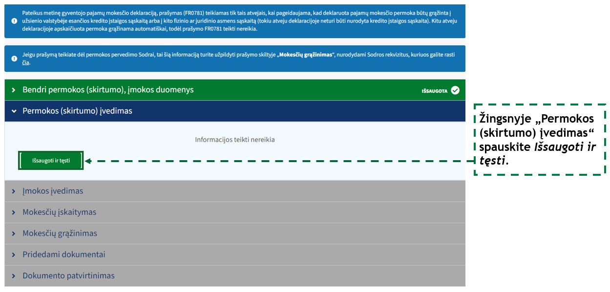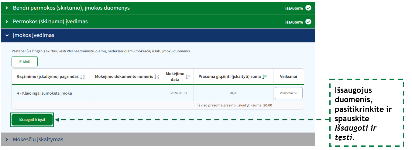 Apskaičiuotas ir deklaruotas 2025 m. deklaracijoje pajamų mokestis turi būti sumokėtas į VMI biudžeto pajamų surenkamąją sąskaitą iki 2026 m. gegužės 4 d. Nuolatinio Lietuvos gyventojo deklaruotas pajamų mokestis sumokamas 1441 kodu.