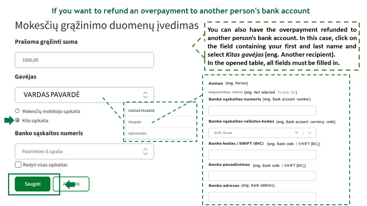 SVARBU. Mokant už kitą fizinį ar juridinį asmenį būtina pildyti išplėstinę mokėjimo nurodymo formą. Joje reikia nurodyti pradinio mokėtojo, už kurį atliekamas mokėjimas, identifikacinį numerį, taip pat pavadinimą arba vardą ir pavardę bei įmokos kodą.
