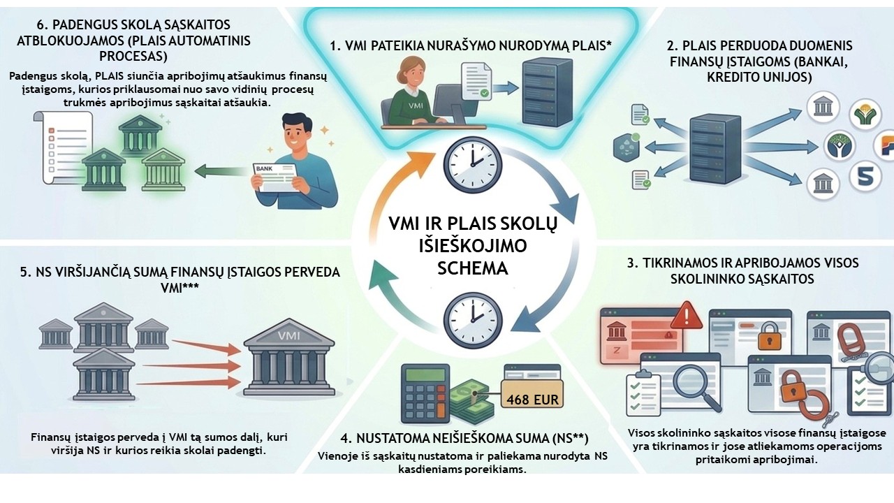 ** Kiekvienam skolininkui fiziniam asmeniui, pradėjus išieškojimą, PLAIS automatiškai parenka sąskaitą ir ten nustato minimalią (arba individualią) neišieškomą sumą (toliau ̶ NS) vartojimo poreikiams, NS nustatoma vadovaujantis Lietuvos Respublikos socialinės apsaugos ir darbo ministerijos 2026 m. sausio 1 d. įsakymu Nr. A1-730 „Dėl 2026 metų minimalių vartojimo poreikių dydžio patvirtinimo“.
