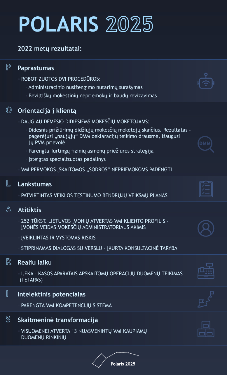VMI POLARIS 2025 - tai organizacijos tikslų žemėlapis, tarsi Poliarinė žvaigždė, vedanti modernaus ir veiksmingo mokesčių administravimo link. Toliau pristatomos pagrindinės strategijos kryptys ir jų priemonės, naujausi kriterijai.