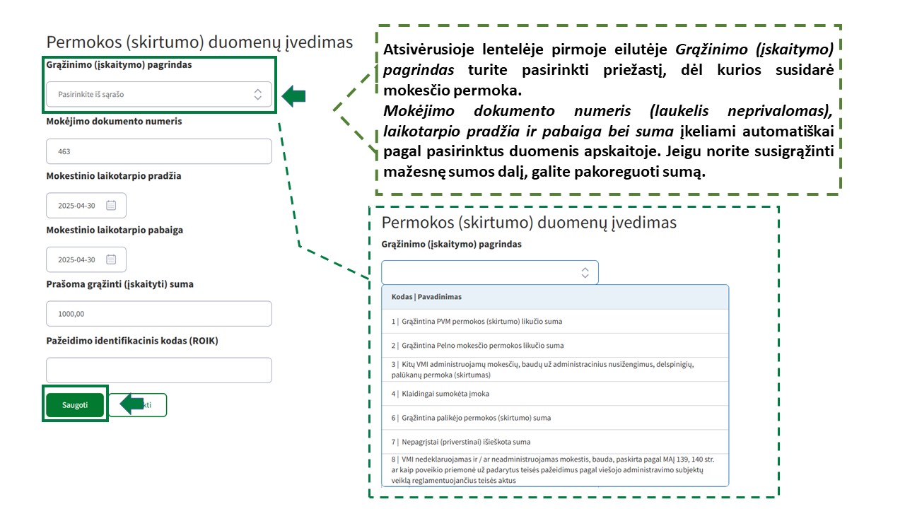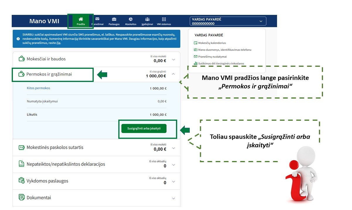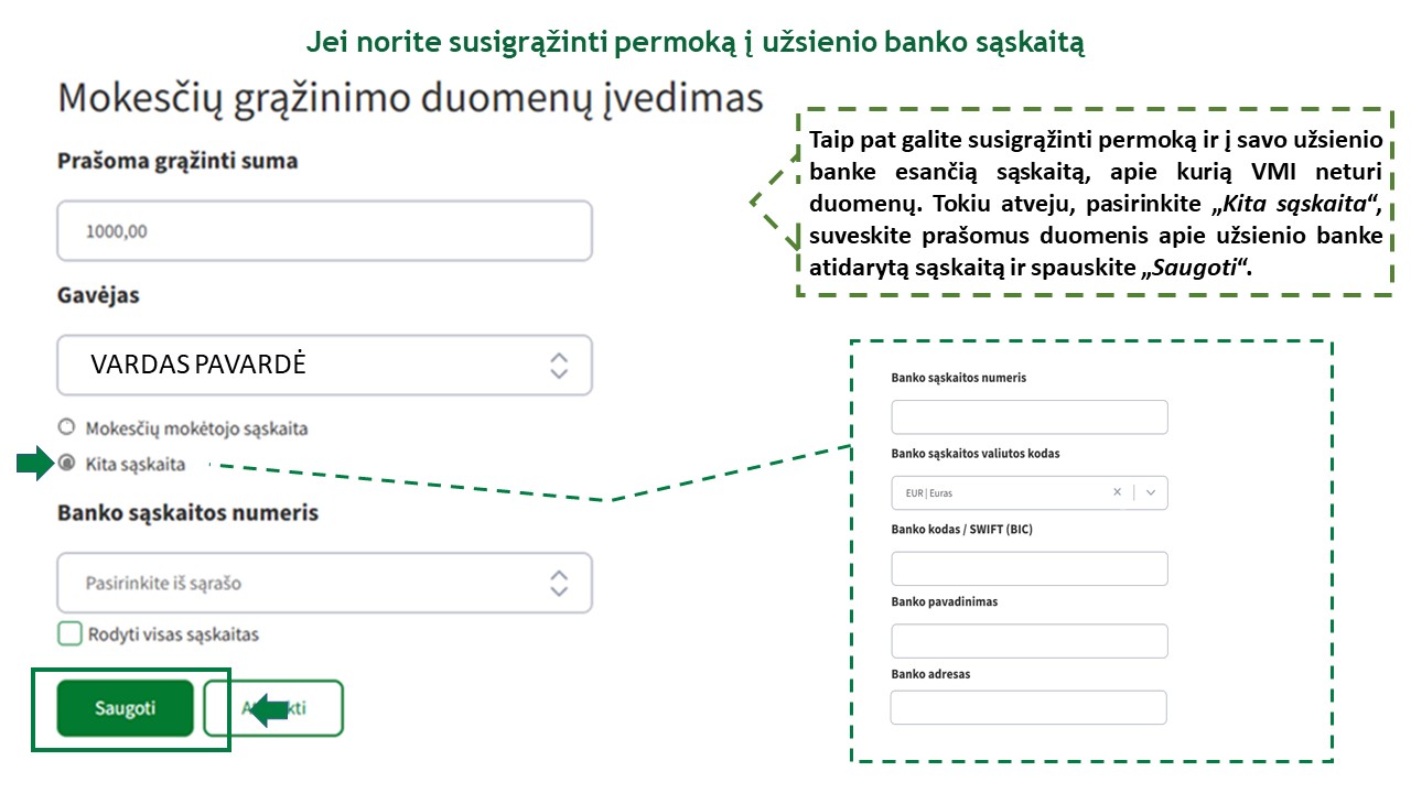 | Be atskiro MM Prašymo mokesčio ir (arba) kitų įmokų permoka ( skirtumas) gali būti grąžinama: |
