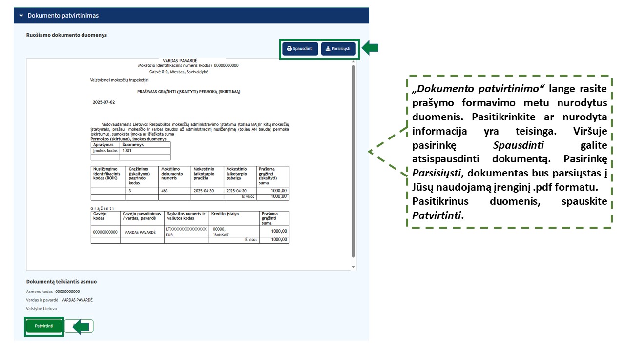 Prašymas mokesčio permokai (skirtumui) grąžinti (įskaityti) (toliau - Prašymas) turi būti užpildytas ir pateiktas, laikantis Taisyklėse nustatytų reikalavimų. Jei pateiktame Prašyme įrašyti duomenys yra neteisingi ir (arba) netikslūs ar nustatoma, kad trūksta papildomų dokumentų ar duomenų sprendimui priimti, VMI vadovaudamasi MAĮ 87 straipsnio 6 dalimi, ne vėliau kaip per 10 kalendorinių dienų ir, atsižvelgdama į MAĮ 111 straipsnio reikalavimus, kai pateikiamas Prašymas dėl nepagrįstai išieškotų sumų grąžinimo, ne vėliau kaip per 5 darbo dienas po Prašymo gavimo VMI dienos jį pateikusiam asmeniui išsiunčia pranešimą per Mano VMI, o jei mokesčių mokėtojas nėra Mano VMI naudotojas, pranešimas siunčiamas Prašyme nurodytu gyvenamosios vietos adresu ar Mokesčių mokėtojų registre įregistruotu adresu korespondencijai gauti, buveinės (biuro) adresu VMI nustatyta tvarka.