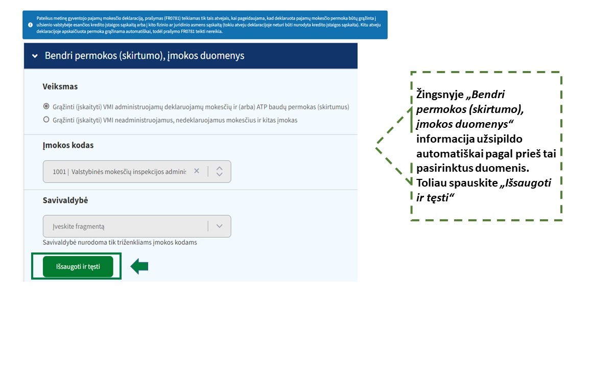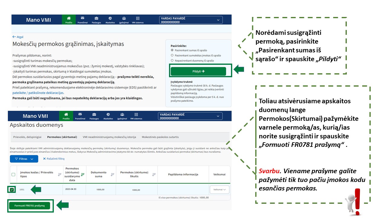 Prašymo susigrąžinti mokesčio permoką į savo banko sąskaitą pateikimas per Mano VMI (FR0781)